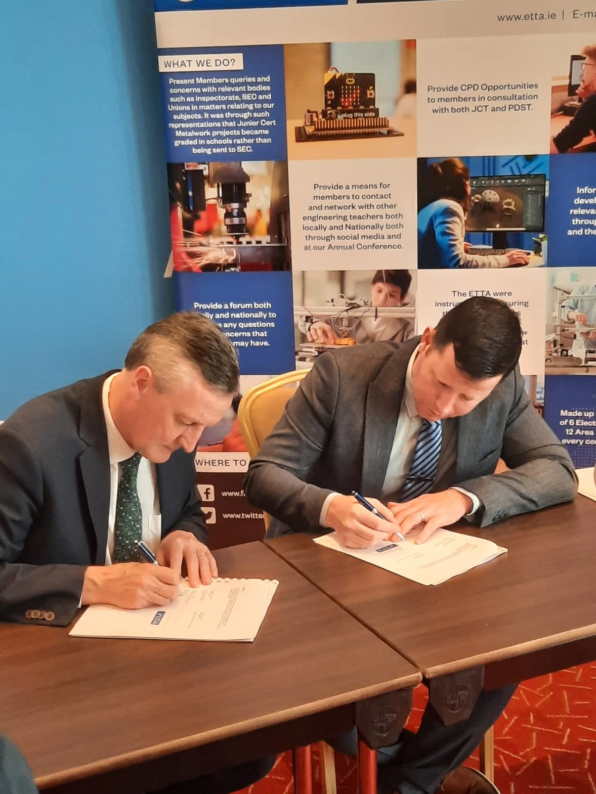 The ETTA today joined forces with Louth Meath Education and Training Board to boost second level STEM education, signing a Memorandum of Understanding with the ETB and their Advanced Manufacturing Technology Centre of Excellence (AMTCE). Chairperson Barry Convey signed on behalf of the ETTA with LMETB CE Martin O Brien. He was joined by Treasurer Colin Whyte, Secretary Billy Higgins, Assistant Chairperson Edel Finlayson, Assistant Secretary Gabija Rudyte and Area 6 Rep Darrell O Brien. This agreement will see the association establish its first official headquarters based in the AMTCE complex in Dundalk. This headquarters will pave the way for the association to support the development of resources, courses and support for the members of the association. It is the first time that any Irish subject association will have a physical base of operations to carry out the business of the association.